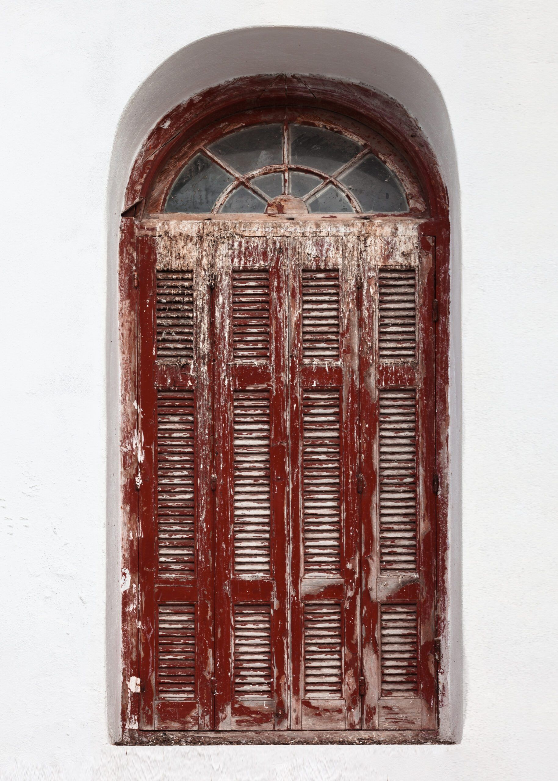 This photograph offers a glimpse into the heart of Mykonos, an iconic Greek island known for its white-washed structures and deep history. The aged, red wooden shutters speak of stories untold, and its rustic charm can serve as a conversation piece, bridging the gap between classic European aesthetics and contemporary home decor.