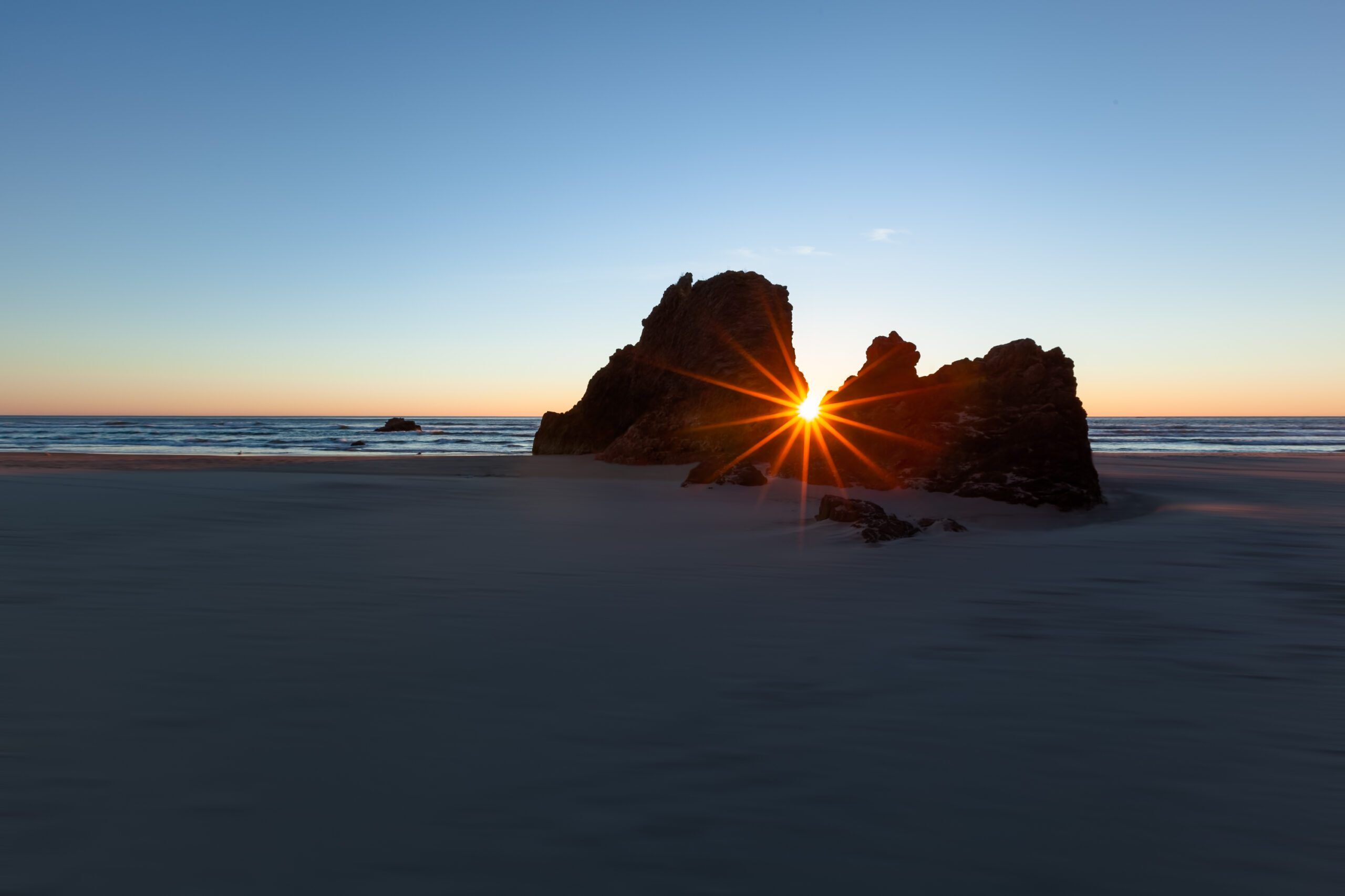 A breathtaking sunset on a Pacific beach, offering a magical spectacle as the sun nestles between a formation of rocks, casting an entrancing golden hue that seems to embrace the entire vista. The undulating waves whisper tales of the day as they gently kiss the shore, setting a tranquil yet vibrant scene that can elevate the aura of any space. Bring this celestial dance between day and night into your home, letting its warm hues ignite a sense of calm and reflection, making it a centerpiece that commands admiration and serene reflection.
