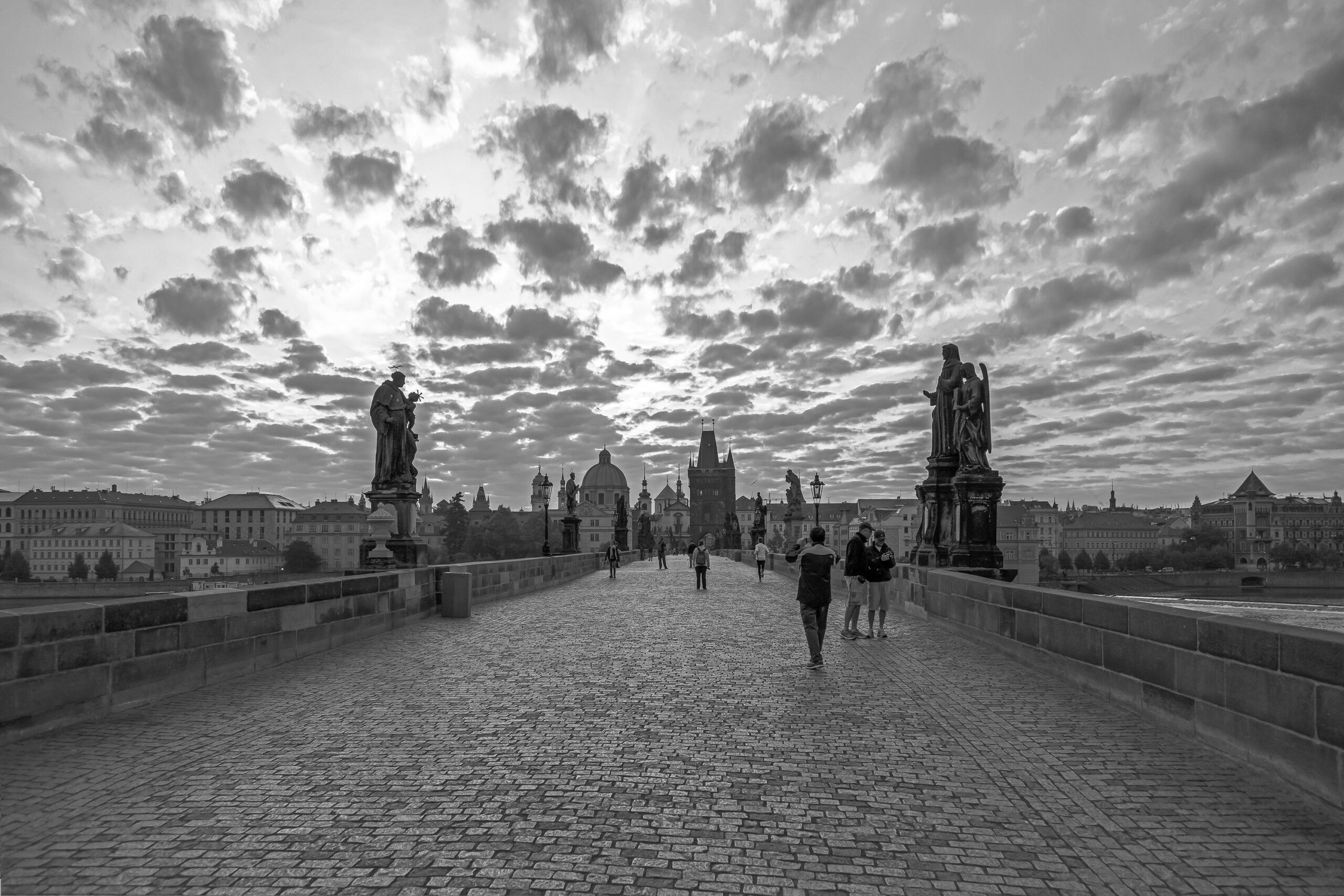 This print encapsulates the serene aura of Charles Bridge, Prague, during the early morning, showcased in beautiful black and white tones.