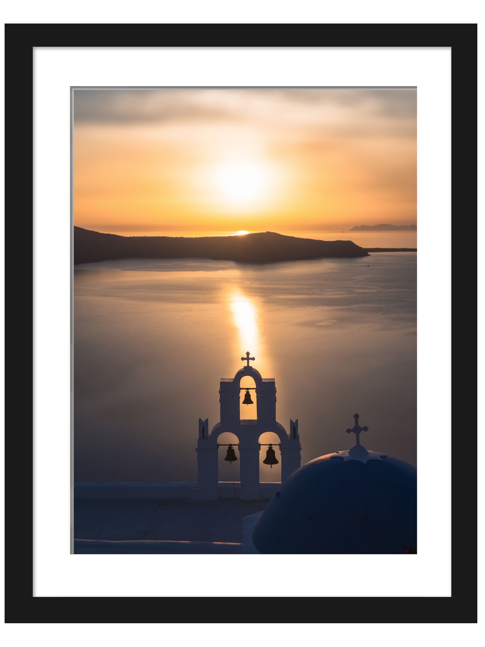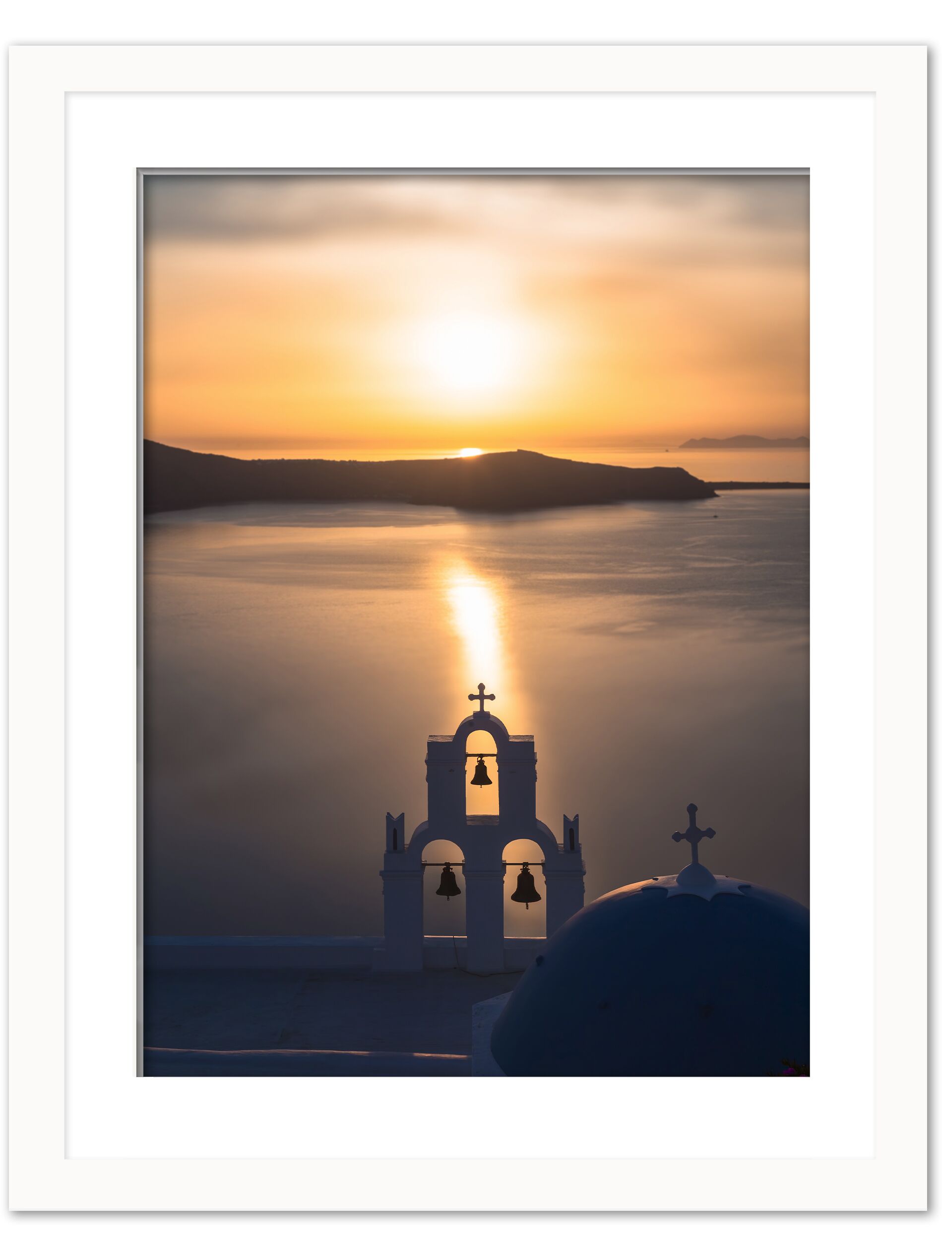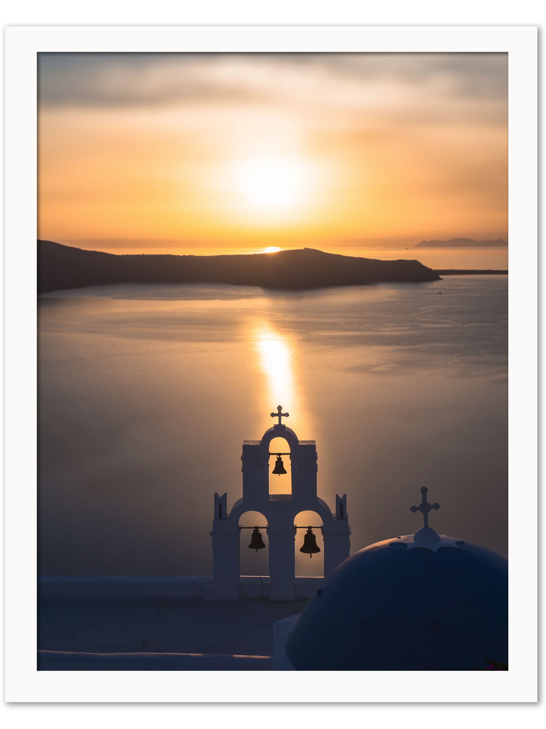 This fine art print captures a peaceful sunset in Santorini, where the silhouettes of church bells frame the setting sun, casting a golden light over the caldera. The image evokes a sense of tranquility and divine beauty, making it perfect for those seeking a touch of spiritual calm in their decor. Ideal for meditation spaces, living rooms, or as a thoughtful gift for lovers of breathtaking landscapes and spiritual settings.