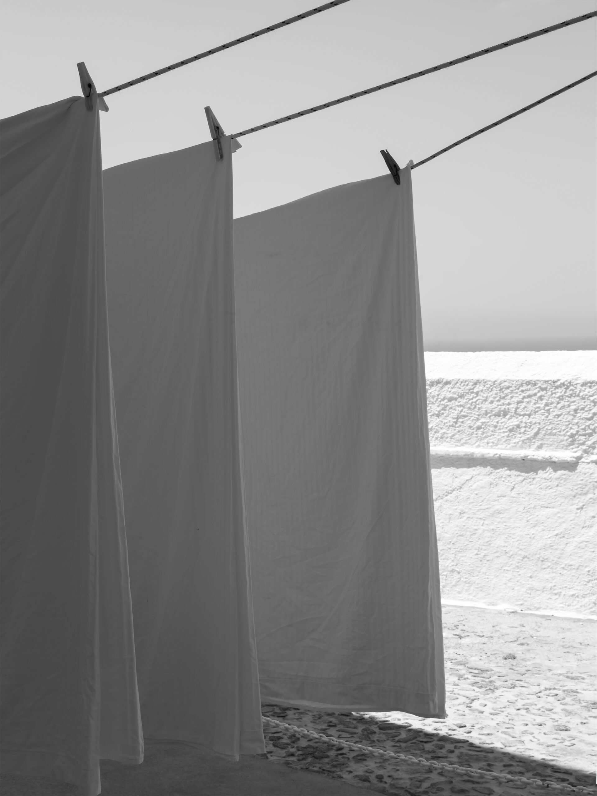 Immerse in the timeless beauty of Fira, Santorini, with this exquisite monochrome print. The simplistic elegance of hanging linens captures the daily rhythm of life in this Greek haven. An impeccable choice for those seeking to bring a touch of Mediterranean tranquility and sophisticated monochrome aesthetics to their living space.