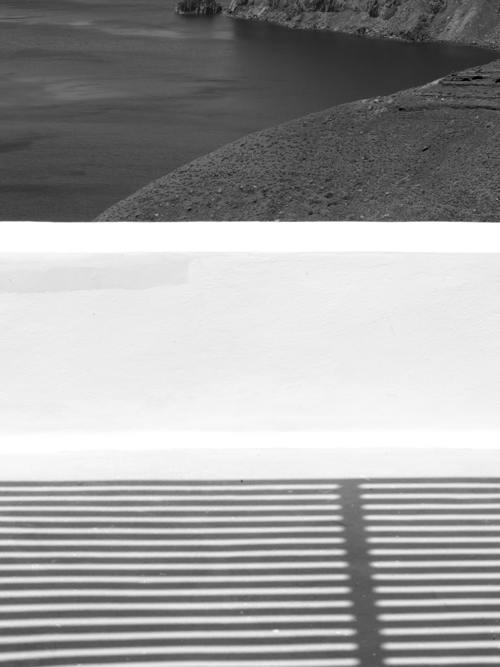 Dramatic geometric shadows cast across a balcony in Santorini, Greece.