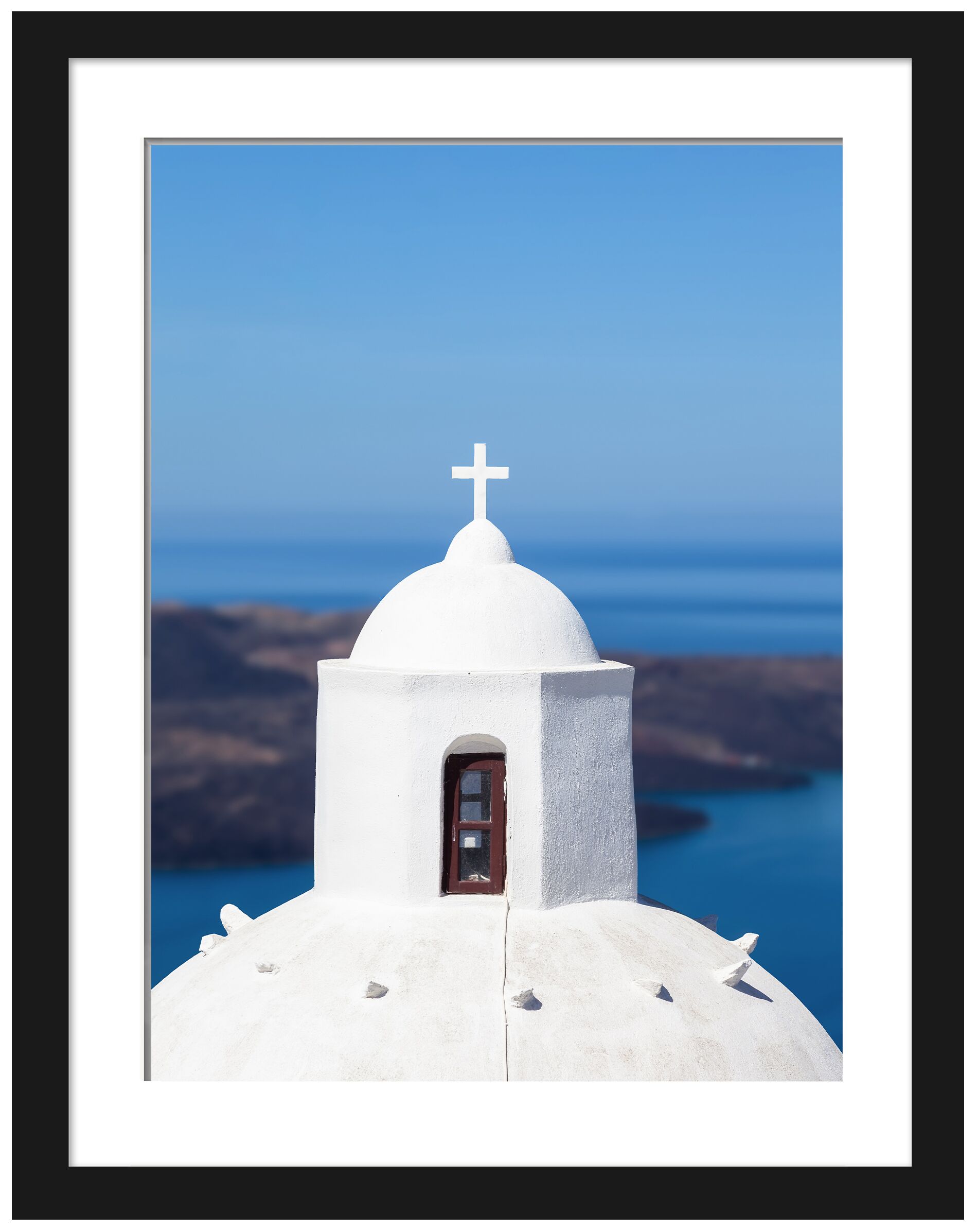 This fine art print captures a stunning view of a white-domed church in Fira, Santorini, elegantly set against the backdrop of the expansive blue caldera. The clean lines and minimalist design make it an ideal choice for those seeking a calm, soothing element in their decor. It is a perfect gift for admirers of Greek architecture and anyone who appreciates the peaceful beauty of the Aegean coast.